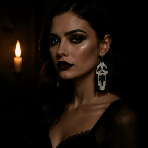 Turn heads this spooky season with these Handmade Beaded Halloween Earrings featuring a hauntingly beautiful ghost face design in the fringe. Expertly crafted with high-quality black and white seed beads, these statement earrings are inspired by classic horror and perfect for Halloween parties, cosplay, or everyday goth glam.