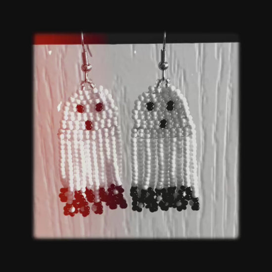 Get into the spooky spirit with these adorable handmade beaded ghost earrings! Designed with white seed beads and accented with black details, these earrings form the shape of a classic ghost, complete with a sweet face and fringe that sways with every movement. Each pair is handcrafted with care, creating a fun and festive accessory perfect for Halloween lovers.