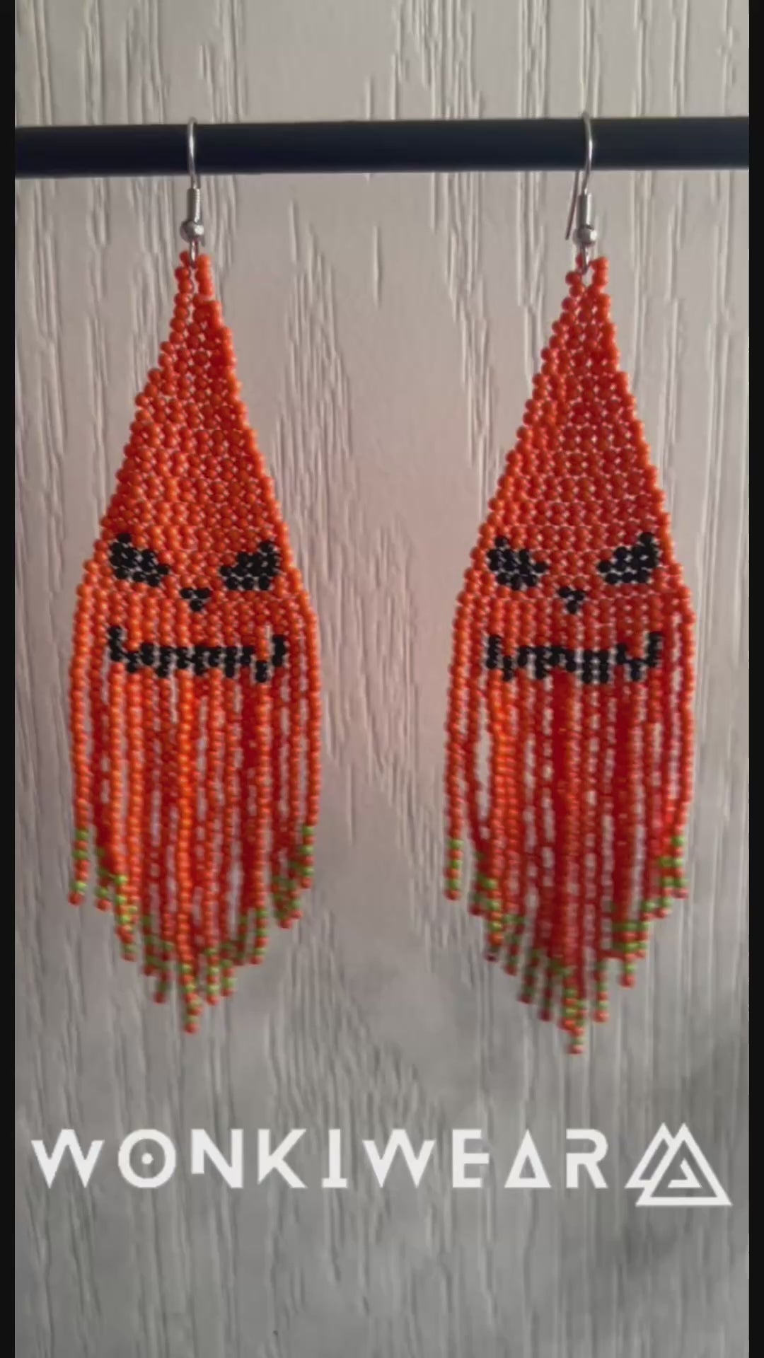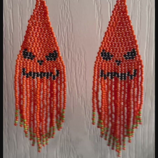 Add a touch of spooky charm to your Halloween outfit with these stunning handmade beaded earrings! Expertly crafted with vibrant orange and black seed beads, these earrings feature a bold jack-o'-lantern face with expressive eyes and a mischievous grin. The intricate design extends into a flowing fringe, giving each piece dynamic movement and festive flair. Hints of green at the tips of the fringe add a subtle pop of colour, mimicking the look of a pumpkin stem. Perfect for Halloween parties, themed events, or adding seasonal style to your everyday look. Lightweight and comfortable to wear, these Halloween beaded earrings are a must-have accessory for any autumn jewellery collection.