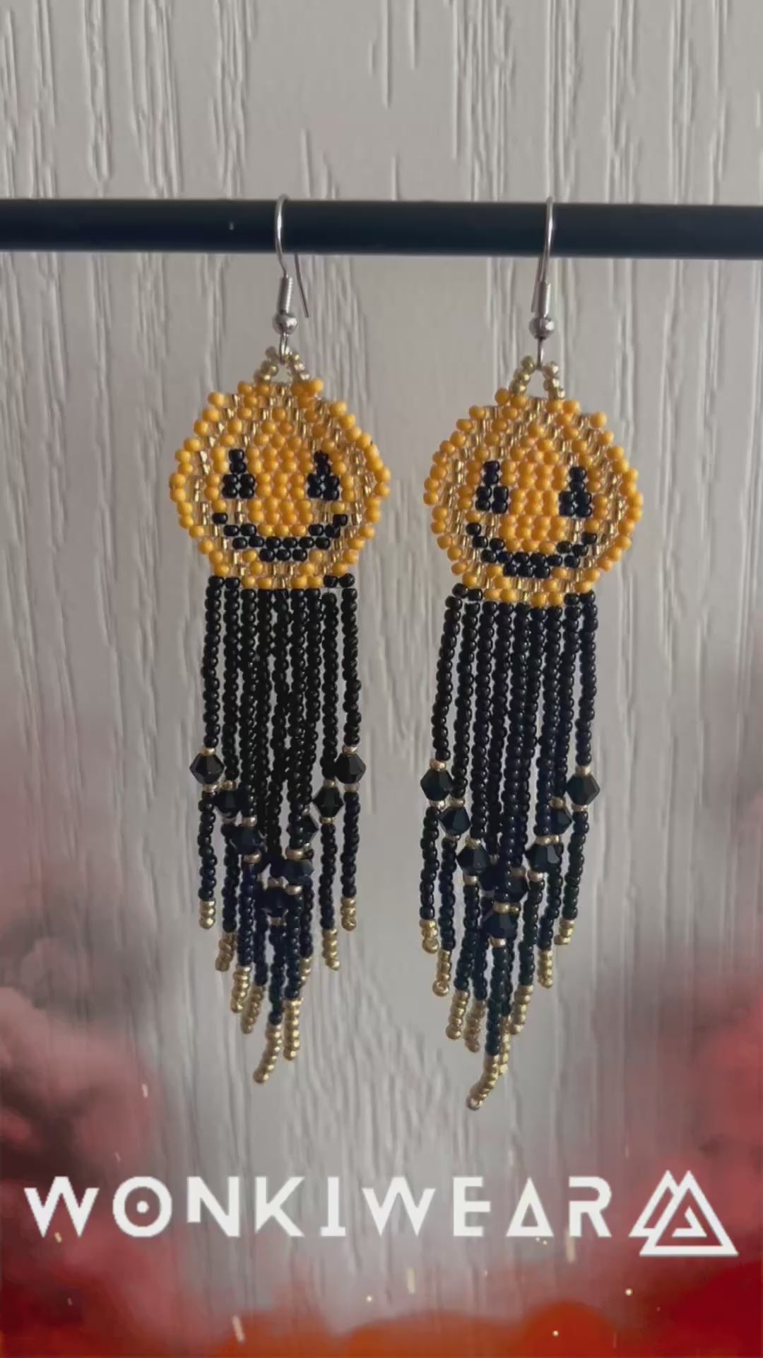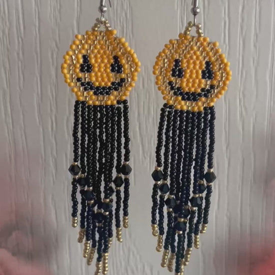 Turn heads this spooky season with these Handmade Halloween Beaded Earrings featuring a playful twist on the classic pumpkin face. Expertly handcrafted using high-quality beads, each earring showcases an orange smiley jack-o'-lantern design at the top, complemented by dramatic, flowing black fringe beading with metallic gold accents.