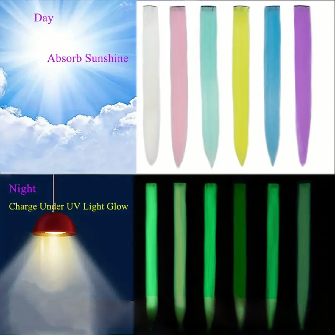 Add a touch of magic to your hair with our Pastel Glow in the Dark Hair Extensions! These clip-in synthetic hair extensions feature beautiful pastel colours and when exposed to sunlight, they will glow in the dark. At 22 inches long, these extensions will make a statement. Price is for one extension.