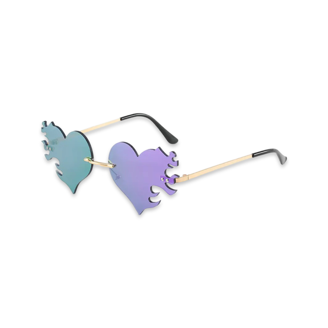 Rock these trendsetting heart and flame-shaped specs and make 'em stop and stare, with a two-tone purple and green combo that's totally hot! You'll be the main attraction with these showstoppin' shades, and all eyes will be on you, no doubt!